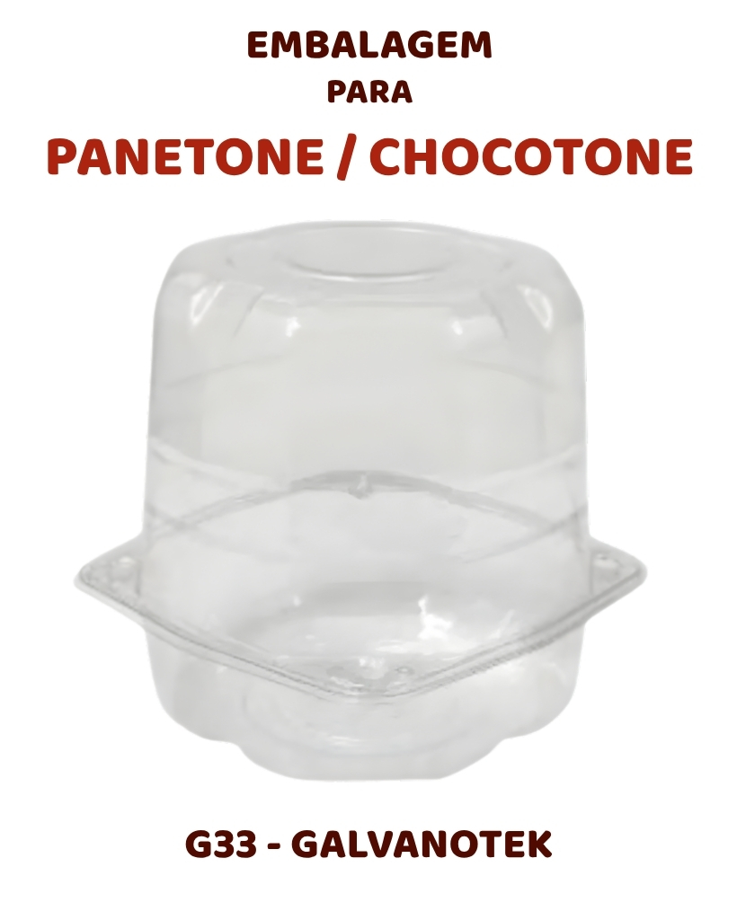 A embalagem G33 da Galvanotek é ideal para panetones, chocotones e muffins de até 500g. Produzida em plástico cristal de alta transparência, valoriza o produto, proporcionando excelente visibilidade e apresentação nas vitrines.