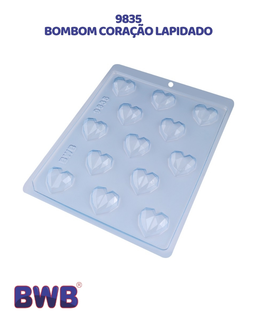 Eleve o nível da sua produção com a Forma Simples Coração Lapidado da BWB. Este modelo traz a tendência do design geométrico para os seus bombons, transformando chocolates simples em verdadeiras joias comestíveis. Com 13 cavidades, ela é ideal para quem busca produtividade e um visual sofisticado que agrega alto valor ao produto final.