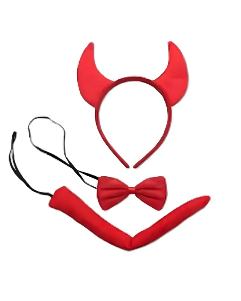 O que vem no kit: 1 Tiara com chifres, 1 Gravata Borboleta e 1 Cauda.