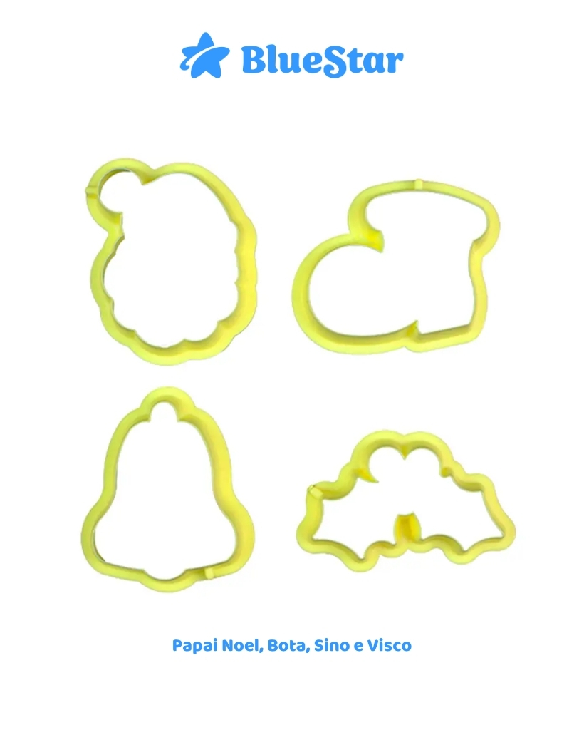 Uma embalagem contém quatro itens nas formas de: Papai Noel, bota do Papai Noel, Sino e visco.