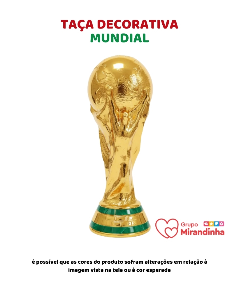 Transforme sua festa ou evento em uma verdadeira final de Copa do Mundo com a incrível Taça Copa do Mundo do Grupo Mirandinha. Inspirada no troféu mais famoso do futebol mundial, essa peça simboliza vitória, conquista e a paixão que milhões de fãs sentem pelo esporte.