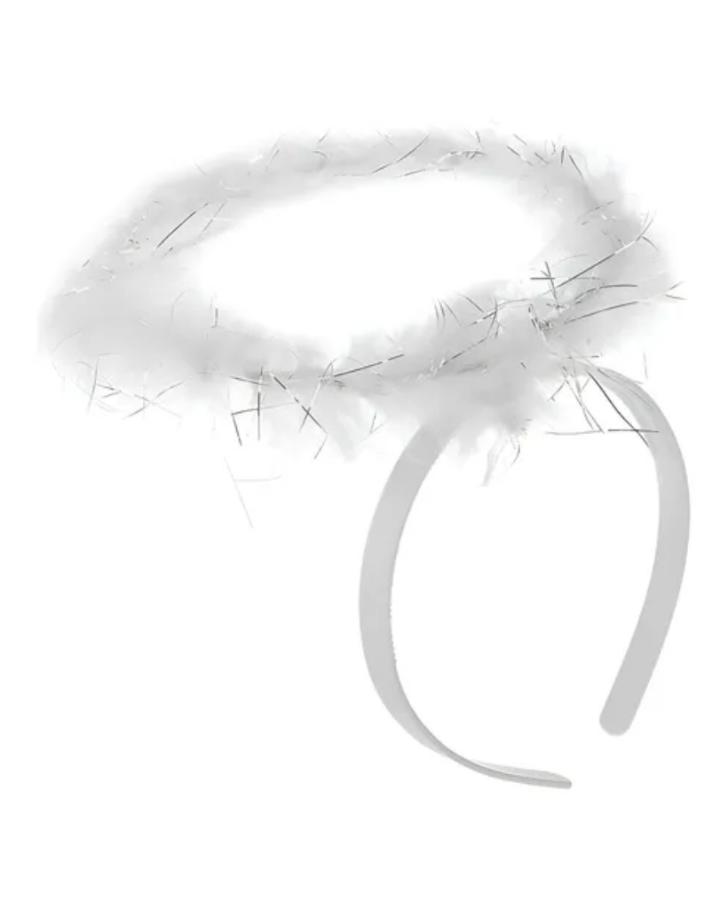 A tiara apresenta uma auréola fofinha feita com penas sintéticas brancas e fios metalizados prateados que refletem a luz, garantindo um brilho especial enquanto você se movimenta. O arco é flexível e discreto, proporcionando conforto para usar o dia todo sem apertar.