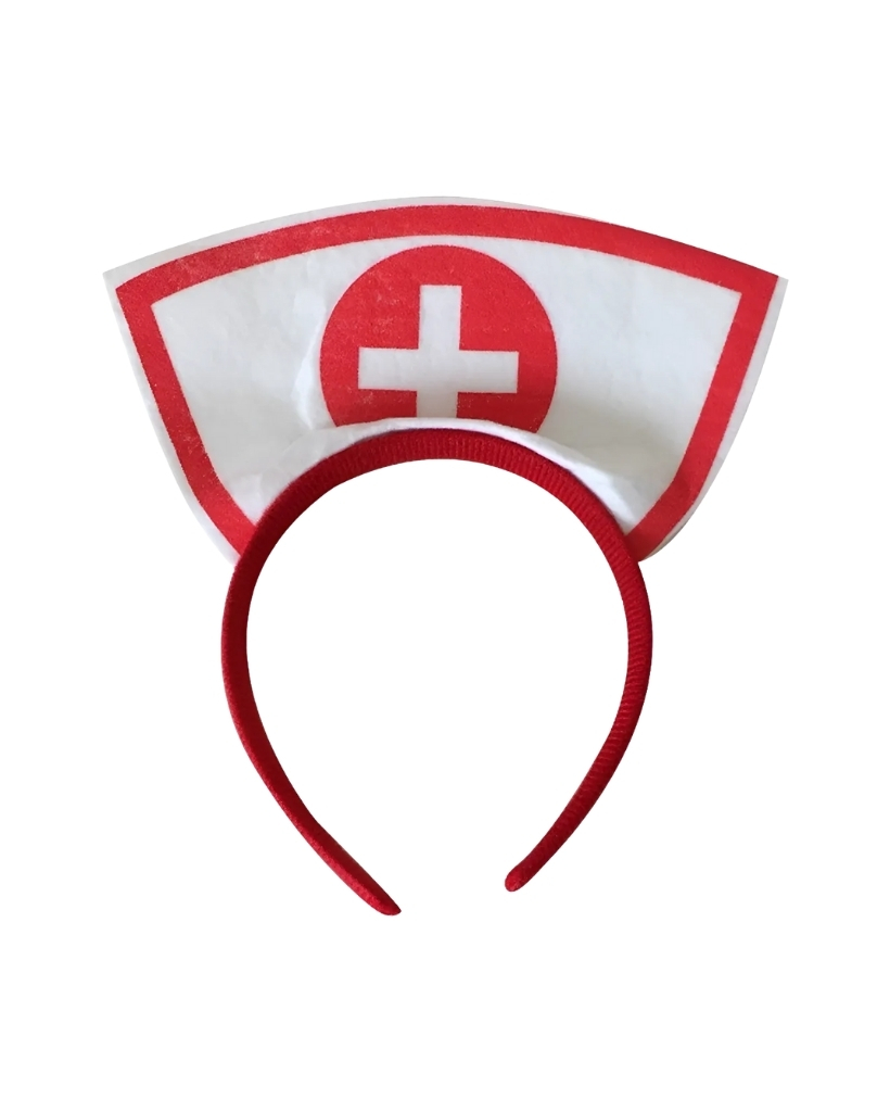 A tiara possui uma base confortável revestida em tecido vermelho e um detalhe frontal que reproduz o chapéu de enfermeira branco com o símbolo da cruz vermelha em destaque. Leve e fácil de usar, ela se adapta perfeitamente a diferentes penteados, garantindo que você aproveite a folia com total conforto.